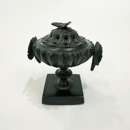 Urn shaped perfumer with lid. Beautiful patinated bronze with decorative butterflies on a square plinth. France, 1820's