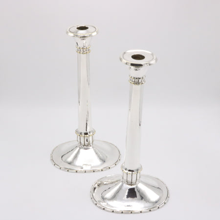 A fine pair of Art Deco period candlesticks Designed and crafted by Dirk Van Erp from USA circa 1920. Each stick is made of silver plated metal. Incised signature: DIRKVANERP, handwrought, San Francisco with windmill logo.
