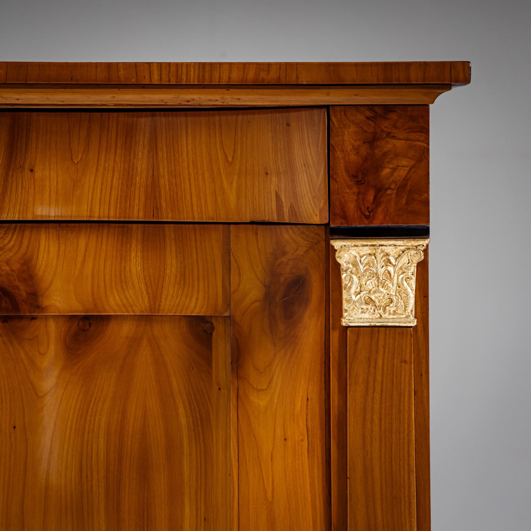 Biedermeier demi-cabinet in cherrywood with a concave front and flanking pilasters featuring gold-patinated capitals and bases. The cabinet is fitted with one drawer and an interior shelf. The surface has been hand polished.