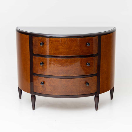 Art Deco chest of drawers in demi-lune shape with three drawers and inlaid glass top. The chest of drawers stands on conical feet and is veneered in thuja root.