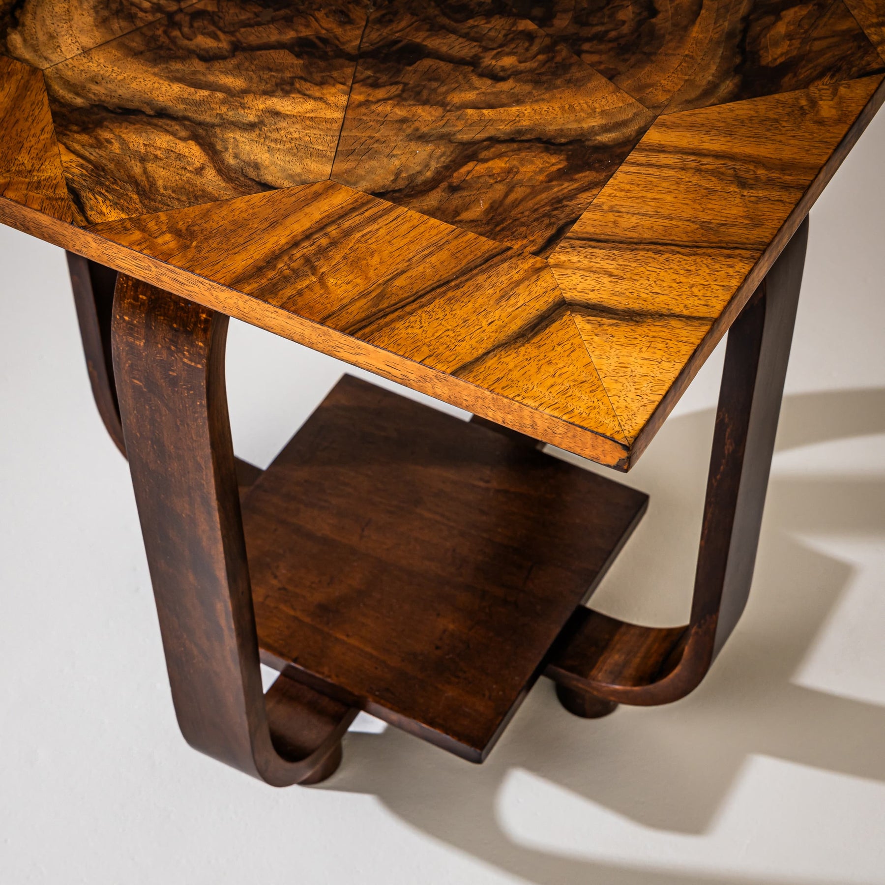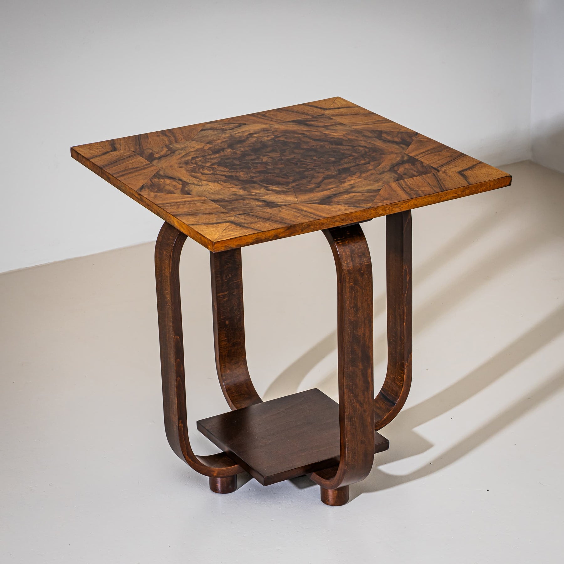 Art Deco side table featuring a square top supported by four curved legs, resting on a square base with cylindrical feet. The tabletop is decorated with a star-shaped inlay and displays an especially attractive walnut veneer pattern.