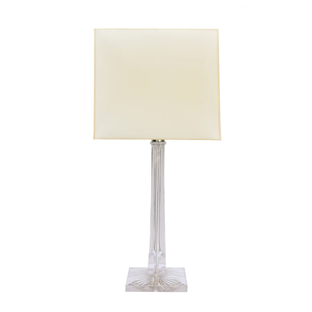 Table lamp with a tulip-shaped cut glass base on a square stand. The table lamp is fitted with an off-white shade. The table lamp is illustrated in the magazine “Das Interieur: Wiener Monatshefte für angewandte Kunst” (The Interior: Viennese monthly magazines for applied arts). The from 1906, where it was shown in connection with a reading room designed by the Austrian architect Marcell Kammerer in London, executed by the company Gebrüder Thonet. The table lamp has a small chip at the base.