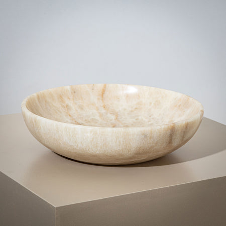 A large, heavy stone bowl made from beige onyx, designed in a minimalist style. The bowl is distinguished by its gently sloping rim and flat, harmonious shape, exuding timeless elegance.
