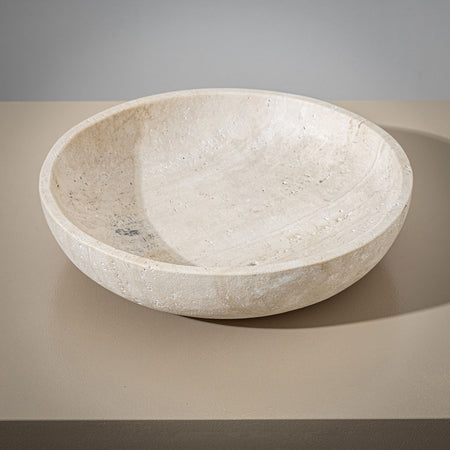 A large, heavy stone bowl crafted from beige travertine, featuring a minimalist design. The bowl is distinguished by its high rim and flat shape, exuding simple yet timeless elegance.