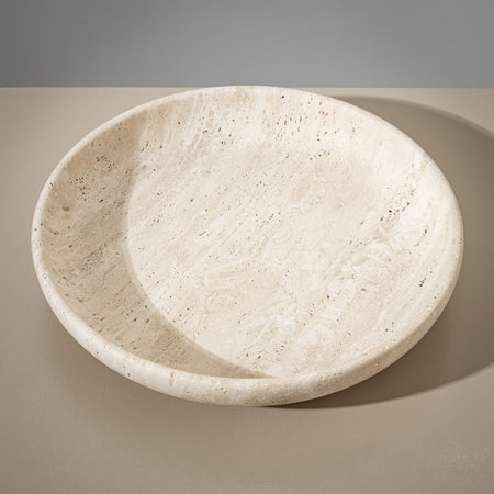 A large, heavy stone bowl crafted from beige travertine, featuring a minimalist design. Its gently sloping rim and flat shape lend the bowl a harmonious and timeless elegance.