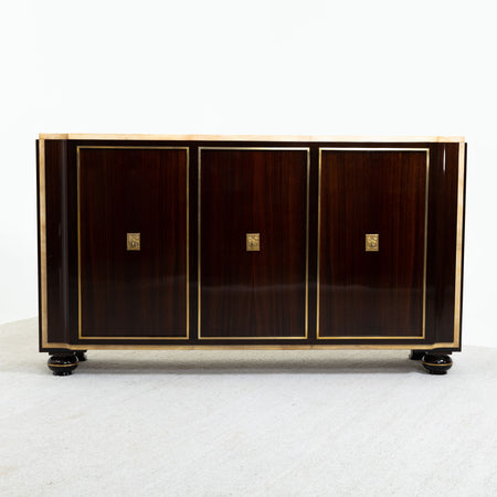 Art Deco Sideboard with three doors and brass profiles and brass escutcheons with figurative relief decor, signed "POSTES". Side doors with shelving and middle section consisting of eight pull out drawers.