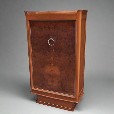 A fine Majorelle designed Art Deco tall two door cabinet. Walnut and walnut burl with nickeled bronze details. Stamped on the back Majorelle.