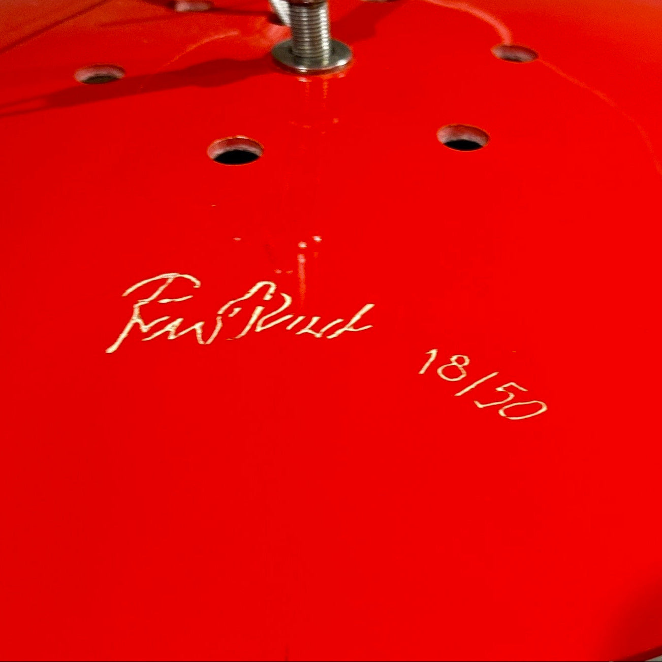 Ron Arad I.P.C.O. Modernist hanging lamp. Red fiberglass "I.P.C.O." (Inverted Pinhole Camera Obscura) Works like a inverted pinhole camera, tiny holes act like lenses and project the light onto its surroundings. Signed by Ron Arad and 18/50 at top. THIS FIXTURE IS NOT UL WIRED.