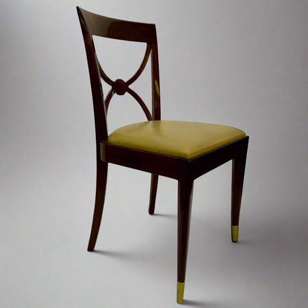 A set of four De Coene Frères designed Art Deco period side chairs from France circa 1930. Each chair is constructed of mahogany with patinated bronze sabots. The elegant double demilune in each back is joined by a circular disc.
