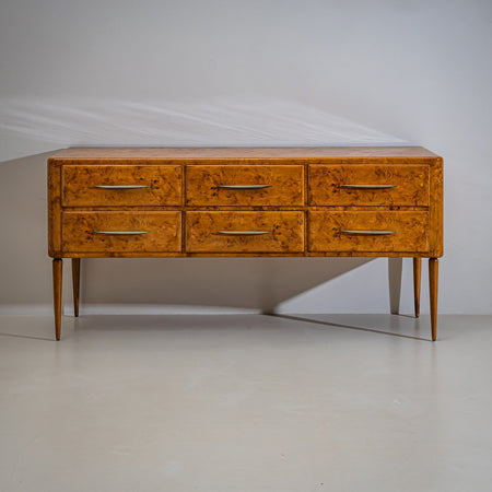 Elegant sideboard featuring a gently concave front, six drawers with long horizontal brass handles, and slender tapered legs. The piece is veneered in richly figured burl wood, professionally restored, and hand-polished to a refined finish.