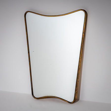 Trapezoidal wall mirror with softly rounded corners and a slim brass frame. The design reflects the refined and architectural aesthetic associated with Gio Ponti.