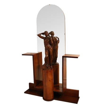 Italian Art Deco Hall Stand with pedestal and figural statue of woman in drapery. Attributed to atelier de Borsani Varedo. Amboyna with original large domed mirror.
