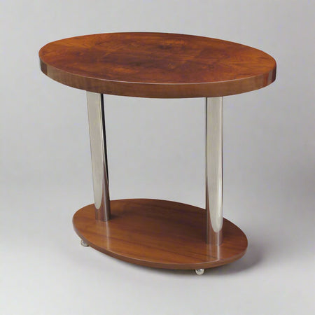 A French Art Deco period oval side table with nickel legs and feet from France circa 1930. The oval top is sheathed in gorgeous burl walnut veneer with the lower shelf showing a pure walnut grain pattern.