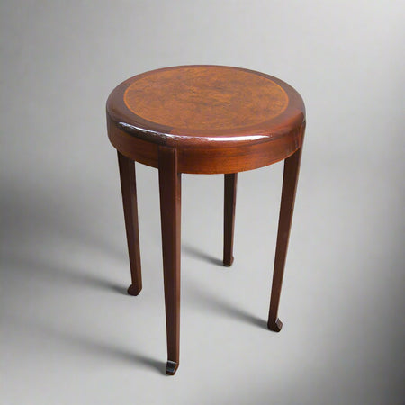 An Art Deco period table with a segmented burl and marquetry top. The four legs each ending in a Chinese style “Chou” foot imbue the table with an elegant air. Signed: R. Deralle