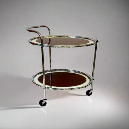 An Art Deco period two-tier mirrored serving cart from France circa 1930. The oval polished nickel frame with mirrored tops standing on caster wheels.