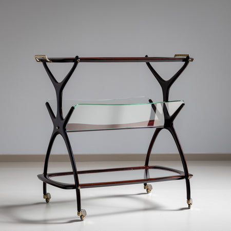 Bar trolley on castors attributed to Cesare Lacca. This elegant piece features a top shelf with a glass base and brass handles. Below, diagonally positioned glass shelves provide convenient storage for magazines or additional items. The bottom shelf also features a glass pane, enhancing its sophisticated appeal. Crafted with a beautifully polished wooden frame, this bar trolley exudes timeless charm and practicality.