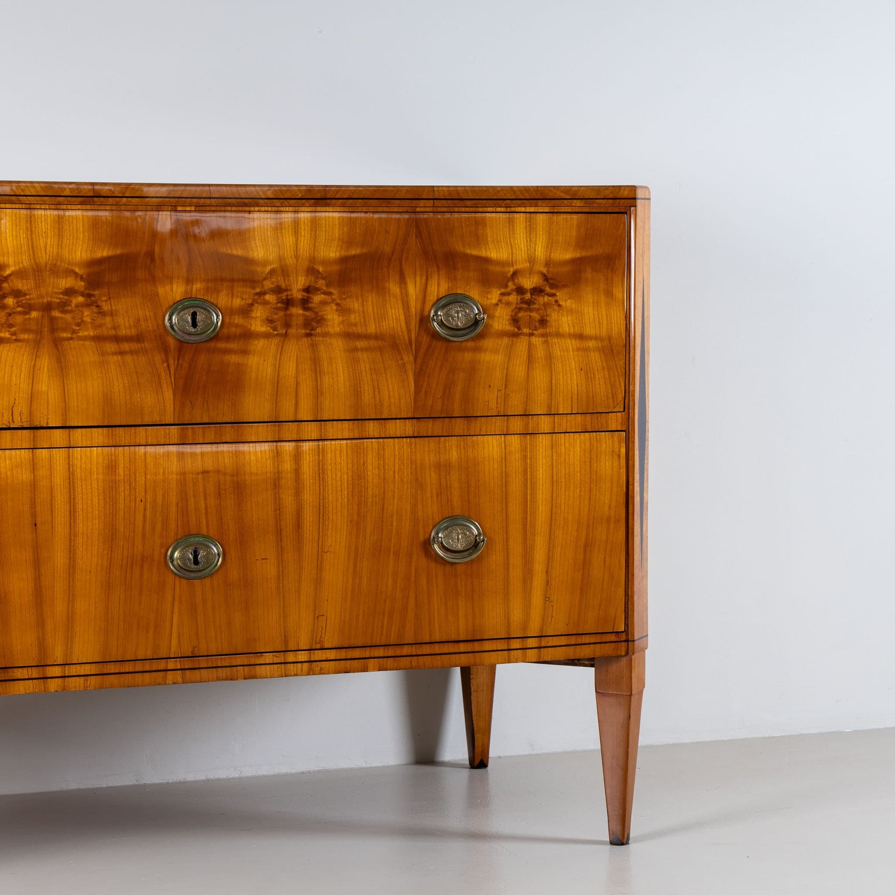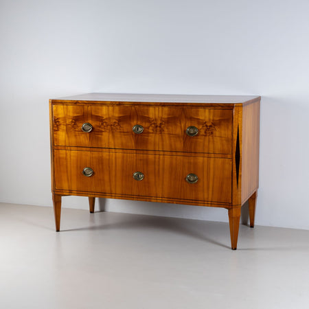 Elegant Biedermeier chest of drawers featuring two drawers and chamfered corners with diamond-pattern marquetry. The front is adorned with oval bronze fittings, complemented by fine thread inlays outlining the cherrywood-veneered, bookmatched surfaces. Expertly restored and hand-polished, this piece embodies the refined minimalism and graceful proportions characteristic of early Biedermeier design.