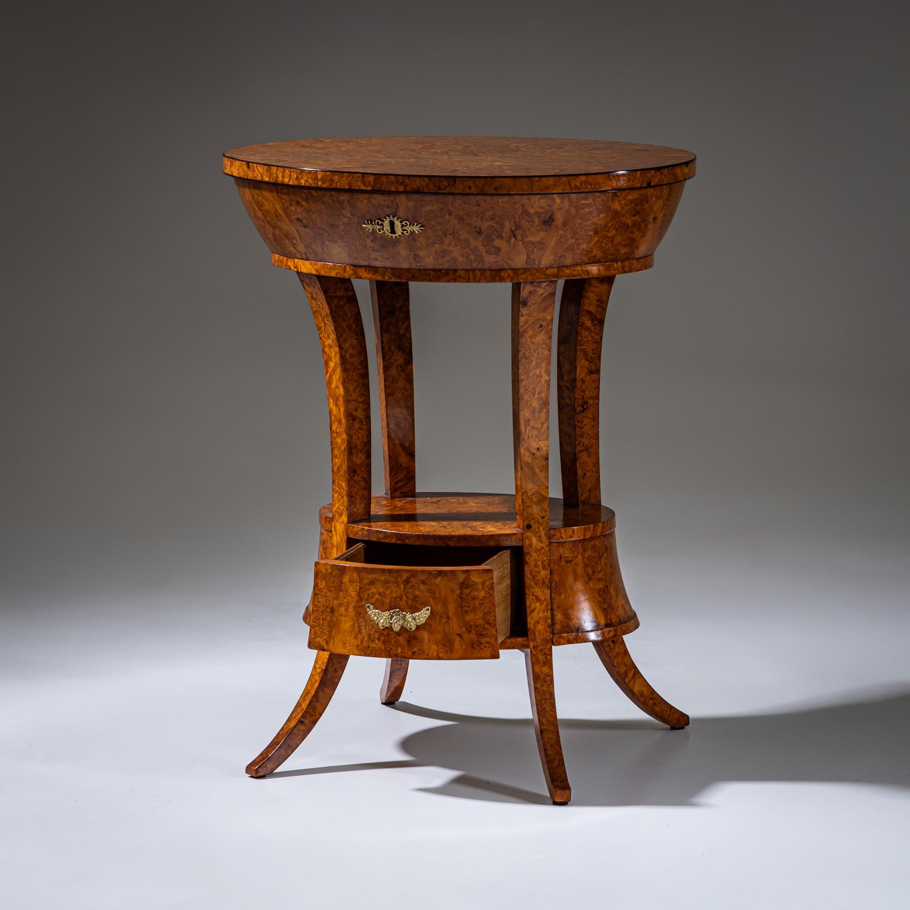 Elegant side table featuring an oval, hinged tabletop. The piece stands on four slender legs and includes a drawer integrated into the drum-shaped central section. Veneered in bird’s-eye maple and adorned with ormolu mounts. When opened, the tabletop is secured by a metal support bar.