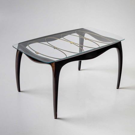 Coffee table with rectangular glass top with rounded corners and elegant wooden frame with slightly curved legs. Oval brass rings under the table top give the table a special touch. The table is attributed to the Italian designer and architect Paolo Buffa (1903-1970).