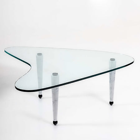 Italian coffee table with boomerang-shaped glass top. The table stands on three conical legs made of white marble.