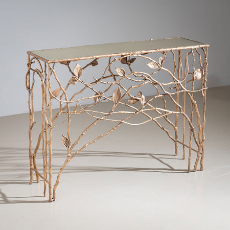 An extraordinary metal console designed in the form of stylized branches adorned with leaf ornaments, forming an arched silhouette. The naturalistic design is strikingly contrasted by its golden finish, while the inset golden glass top adds even more elegance. The console is signed "Goldstein," dated 2017, and marked as a one-of-a-kind piece, numbered 1/1.
