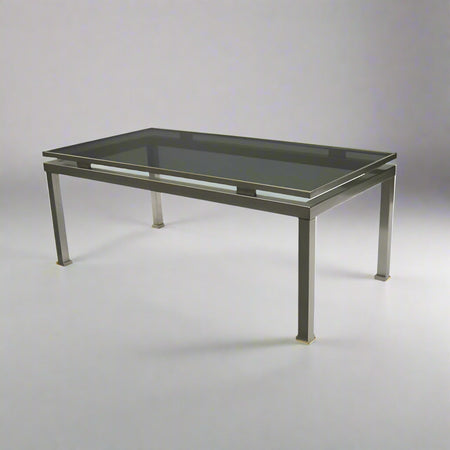 A Modernist cocktail table with glass top. Brushed nickel with smoked glass top.