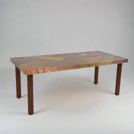 Italian Modernist dining table By Lorenzo Burchiellaro Wooden legs and shelves made of hammered and riveted metal surfaces in geometric patterns. Laterally stamped "Burchiellaro".