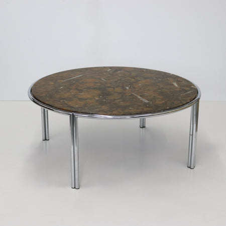 An Italian Modernist coffee cocktail table with fossil marble top from Italy circa 1950.  The circular nickel base with large marble top containing embedded ammonite and orthoceras fossils dating back to around 400 million years ago. Please note how al four legs are a double column continuous with the frame that encloses the fossil top.