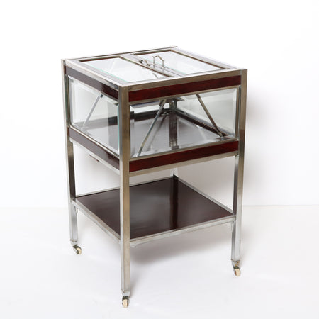 Bar Cabinet, in the form of a Lawyer's coffin.  The inside storage compartment raises when you open the two top doors to become a serving area.   It has a lower shelf for additional storage. Mahogany and chrome.  USA 1960's.