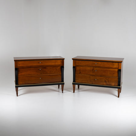 Pair of Biedermeier chests of drawers with three drawers, raised on tapering, slightly curved legs. The edges and side volute pilasters are ebonized. A discreet brass band frames the lower section of each commode. Made of walnut, the pieces have been carefully restored and hand-polished.