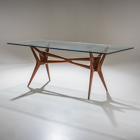 A refined dining table crafted in the 1950s. The sculptural wooden base features gracefully curved supports and sharply tapered, splayed legs, creating an elegant and airy presence. The rectangular glass tabletop rests delicately on four points, enhancing the sense of lightness and structural finesse.
