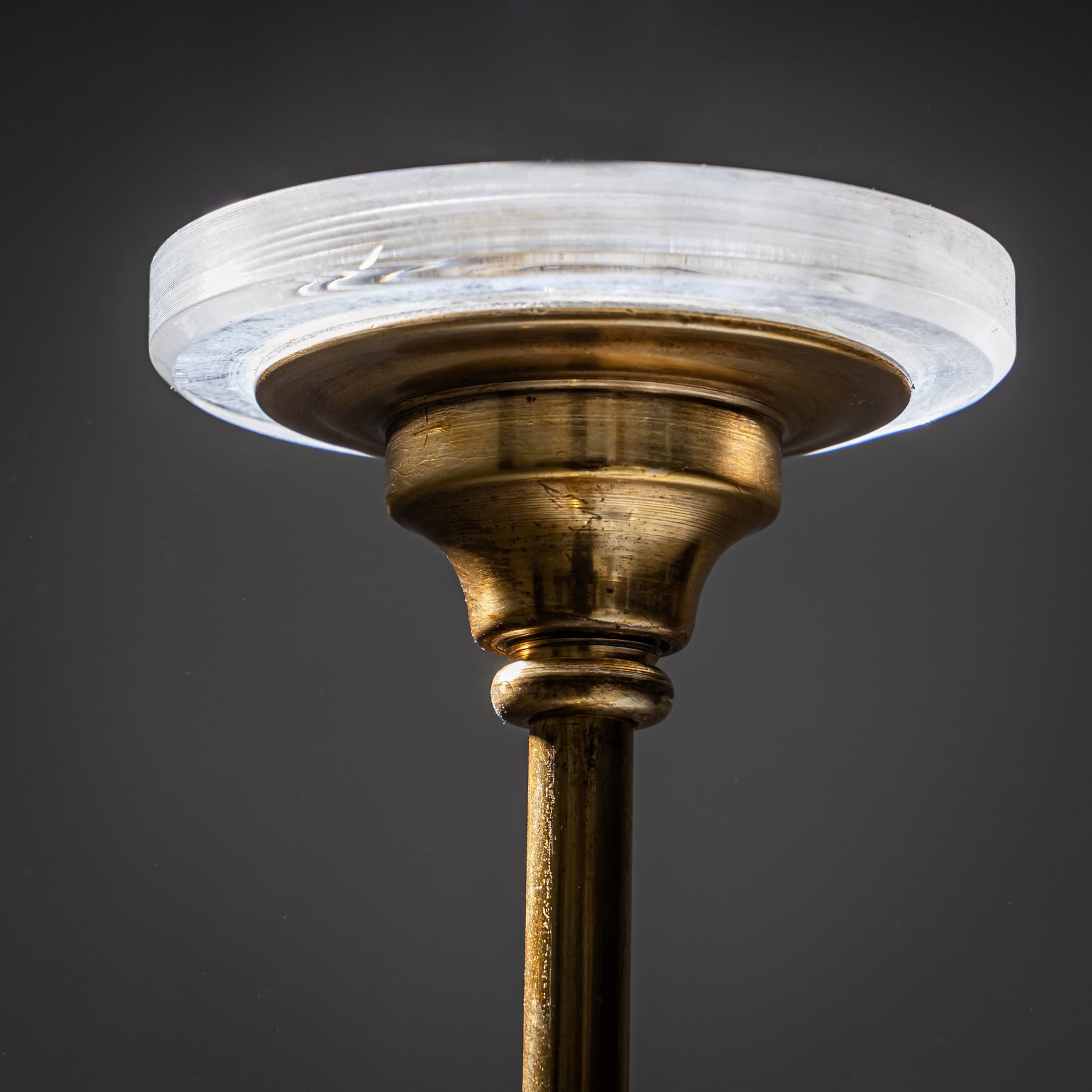 Large-scale Sputnik chandelier in brass featuring twelve angled arms composed of slender rods, radially arranged around a central spherical body. The sphere is accented below with a finial element. The chandelier is suspended from a smooth rod and finished with a clear glass disc serving as the ceiling canopy.
