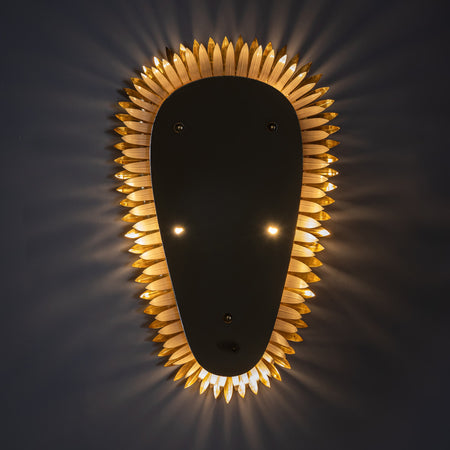 Large wall mirror with an elongated oval mirror plate, framed by a double-layered sunburst design in brass. The front layer is accented in cream white, adding depth and visual contrast. The original mirror glass shows areas of age-related silvering loss.