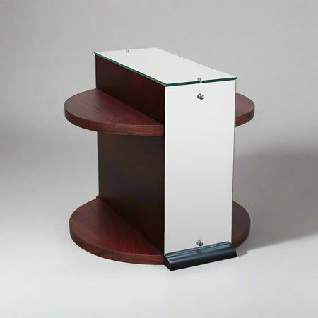 A unique French Art Deco period table from France circa 1930. The top and front and rear surfaces are clad in mirror glass. The body of this Art Deco side table is constructed of mahogany and feature four half moon Demi lune shelves. Because the table is finished on all four sides it is suitable to be positioned in a free floating area of an interior. Please notice that the base of each vertical mirror panel is protected by an ebonized molding.