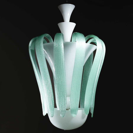 Large Venini chandelier made of Murano glass with a white central glass body surrounded by turquoise blue leaf-shaped tendrils. The design was made by Tomaso Buzzi between 1931 and 1935. Lit: Venini Catalogue raisonné 1921-1986, p. 255