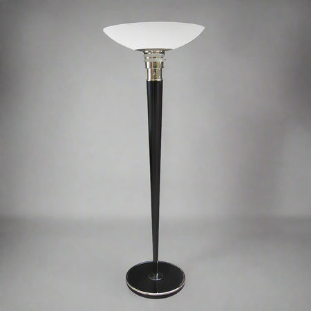 An Art Deco period torchere floor lamp designed by Jean Perzel from France circa 1930. The circular black lacquer stand and shaft have nickel bronze and cut glass details and features a large frosted glass shade. The powerful silhouette creates a striking appearance in any interior.