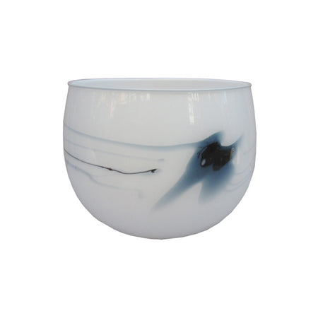 A Holmegaard glass cache pot designed by Michael Bang from Denmark circa 1970. The opaque white glass cache pot (literally “hiding pot” in English) features blue colored swirl patterns with an asymmetrical design.