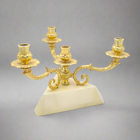 An Aldo Tura Modernist three arm candelabra. Patinated brass arms with wooden base covered in laquered parchment. The maker label is located on the underside of the candelabra.