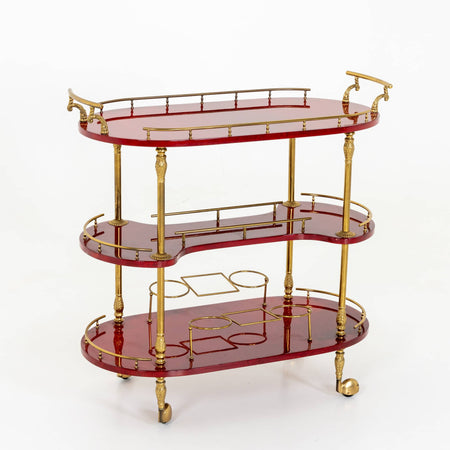 An Aldo Tura Modernist three tier bar cart. Patinated brass details and red lacquered parchment.