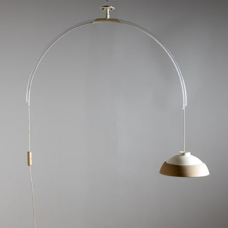 The "2129" ceiling lamp is a striking piece crafted from white lacquered metal, designed by Gino Sarfatti for Arteluce in 1969. Featuring an arched design with a counterweight, it boasts a round lampshade (Ø40 cm) with a beige edge. The arch is adorned with a transparent Plexiglas tube. This impressive fixture not only illuminates spaces but also serves as a captivating statement piece. Lit: Clémence & Didier Krzentowski: The Complete Designers' Lights II. Zurich and Paris 2014, p. 300f.