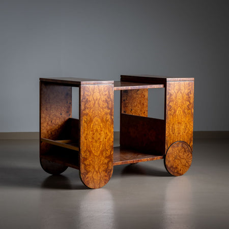 This elegant Art Deco-style bar cart is a stunning example of Mid-20th-Century design, featuring a rich burl veneer that adds a luxurious touch to its overall appearance. The table is designed with both functionality and style in mind, offering holders for bottles, making it perfect for entertaining. The front legs are rounded and the rear features two wheels.