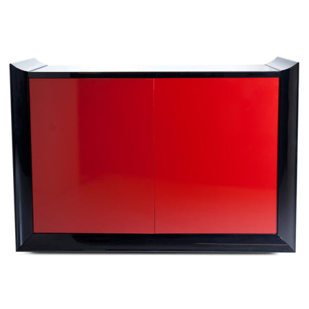 A bar cabinet by Gio Frigerio. Red lacquer doors and mirrored interior. Makers label affixed to back.