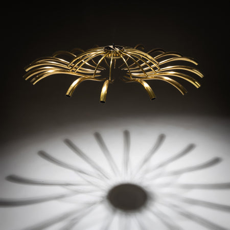 Large and rare chandelier designed by Oscar Torlasco for Lumi, circa 1955. Crafted from polished brass, the fixture features 18 elegantly curved arms radiating outward from a central brass ring adorned with fine, thin rods. A sculptural and striking example of Italian mid-century lighting design.