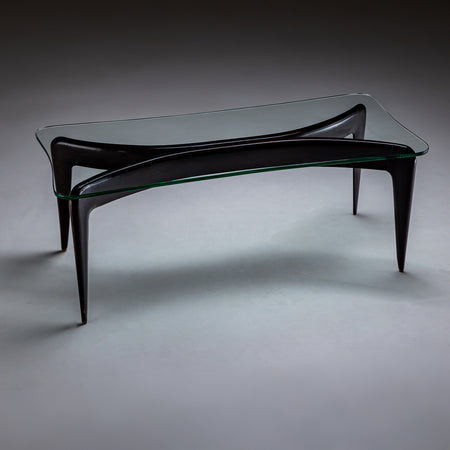 Italian coffee table attributed to the Italian designer and architect Gio Ponti (1891-1979) on black conical legs and an elegantly curved frame. The glass top rests on top of this and has a corresponding concave shape.