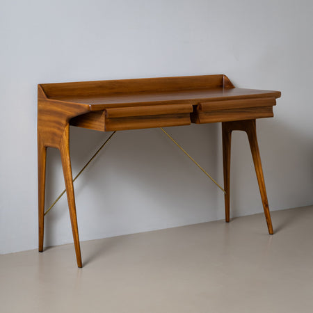 A delicate walnut desk, crafted in Italy in the mid-20th century. It features two drawers and brass stabilizing rods, adding both structural integrity and refined aesthetics.