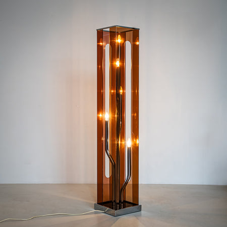 Floor lamp with a violet plexiglass shade featuring elongated cut-outs, set on a square metal base. Inside, five bent metal rods each terminate in a socket. An elegant source of indirect light with a warm, atmospheric quality.