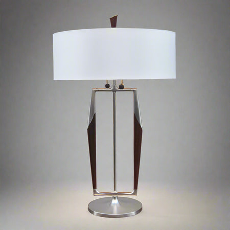 A Gerald Thurston designed Modernist table lamp from the USA circa 1950. This impressive lamp has a brushed nickel finish with lacquered wood details and the original lamp shade with diffuser is topped with a distinctive finial. The striking silhouette has a contemporary flair and the double light socket enables different levels of illumination.