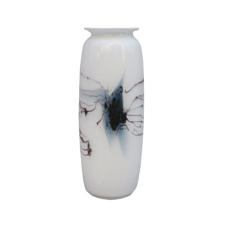 A Danish Holmegaard glass vase designed by Michael Bang from Denmark circa 1970. The gorgeous opaque white glass features blue colored swirl patterns having an asymmetrical effect.