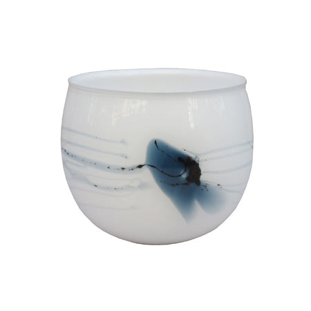 A Danish Holmegaard glass cache pot designed by Michael Bang from Denmark circa 1970. This unique opaque glass cache pot (literally “hiding pot” in English) features blue colored swirl patterns visible from every direction.