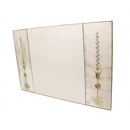 Horizontal Italian Modernist wall mirror. Three mirror panels surrounded by a patinated brass border with floral inset brass details on the panels flanking the central mirror.